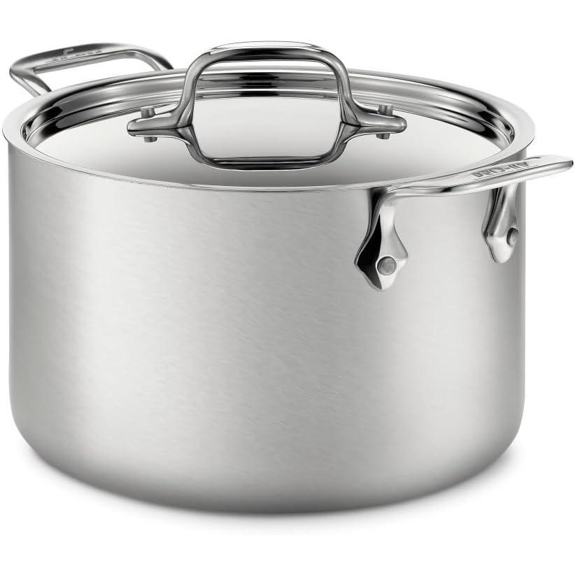 This soup pot isn't just for soup. It’s also great for simmering sauce, boiling pasta, blanching veggies, and stewing. Its tall sides and fitted lid minimize evaporation to keep your soup from reducing too much. As part of our D5 Stainless Collection, this Soup Pot is made with our patented process that bonds 3 layers of stainless steel with 2 layers of aluminum. It distributes heat more evenly and slowly, eliminating hotspots, so your food doesn’t stick or burn. For an added touch of style, it has a timeless brushed finish that adds a bit of texture and refinement to your kitchen and is easier to clean. At 4 quarts, it’s the perfect size for making small batches for the family or enough to meal prep for the week. To keep your All-Clad looking brand new, we recommend washing your cookware with a soap and sponge instead of the dishwasher. Like all our bonded cookware, it's handmade in the USA at our Canonsburg, PA factory with ultra-durable materials that'll last a lifetime and never go out of style. A flat, stainless-steel lid is included to help lock in moisture. Handles & handle loops are made in China.
